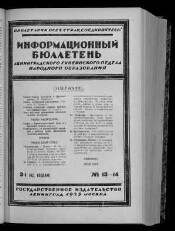Бюллетень Ленинградского областного отдела народного образования. - Ленинград, 1923-1931. - Изд-во: 1925 - 1926 № 14 Гос. изд-во; 1926 № 15 - 48 Ленингр. Губ ОНО; 1928 Ленингр. ОблОНО; 1929 - 1930 № 22/23 "Работник просвещения"; 1930 № 24/25 - 26/27 Гос. изд-во; 1930 № 28/29 - 1931 Гос. учеб.-педагогич. изд-во. Загл.: 1923 - 1924 № 4 Информационный бюллетень Петроградского губернского отдела народного образования; 1924 № 5 - 1926 Информационный бюллетень Ленинградского губернского отдела народного образования; 1927 № 1 - 36 Бюллетень Ленинградского губернского отдела народного образования; 1927 № 1 (37) - 1931 Бюллетень Ленинградского областного отдела народного образования. До № 30 изд. вых. отд. листовками. В б-ке нет.