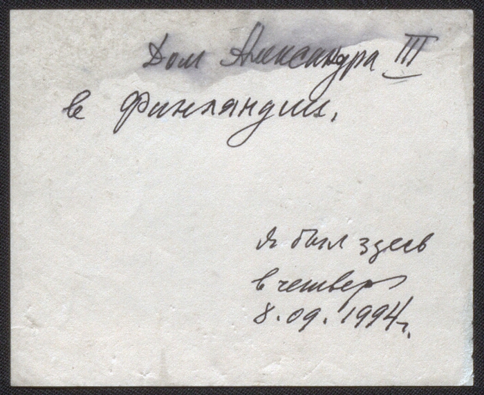 Langinkoski. [Дом Александра III в Финляндии] [Изоматериал : электронный ресурс] : [открытка]. - Электронные данные (2 файла : 1,0 МБ). -(Санкт-Петербург: Президентская библиотека , 2017). - Режим доступа: интернет-портал Президентской библиотеки. Заглавие с экрана. На лицевой стороне под изображением надпись: Langinkoski. На оборотной стороне - надпись от руки: Дом Александра III в Финляндии. Я был здесь в четверг 8.09.1994 г. Электронная репродукция открытки: Langinkoski. [Дом Александра III в Финляндии] [Изоматериал]. [До 1994]. 1 открытка : фотопечать. Местонахождение: Из частного собрания (Аникушин М. К.). Копирование пользователями не разрешается.