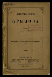 Литературная жизнь Крылова / [соч.] академика Я. К. Грота. - Санкт-Петербург : типография Императорской Академии наук, 1868. -[2], 47 с. : табл.. - Библиография в подстрочных примечаниях. - Приложение к XIV тому Записок Императорской Академии наук № 2. - На титульном листе штамп: Книги из собрания П. К. Симони.