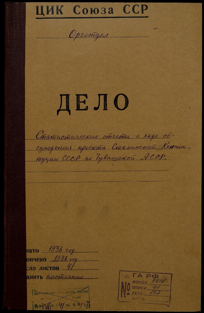Заголовок дела на папке: Статистические отчеты о ходе обсуждения проекта сталинской Конституции СССР по Чувашской АССР