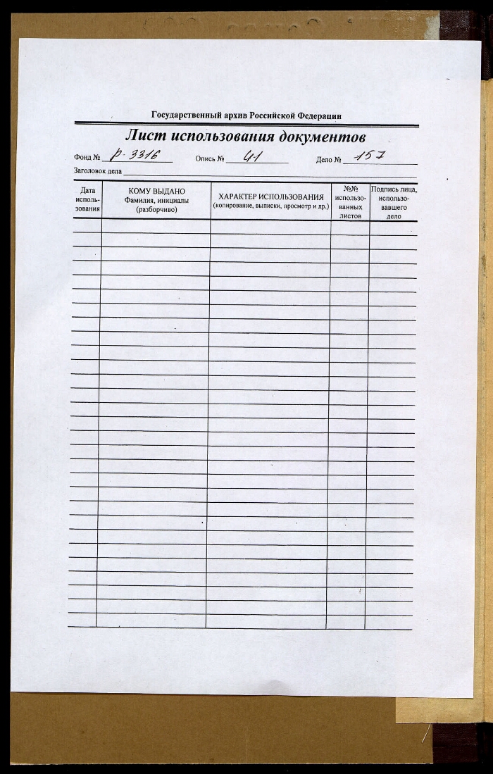 Шифр хранения ГА РФ. 3316 / 41 / 157