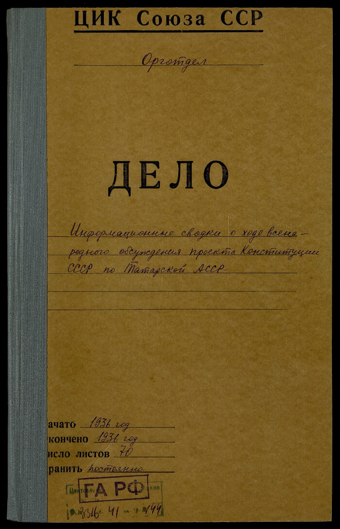| Примечания | Заголовок дела на папке: Информационные сводки о ходе всенародного обсуждения проекта Конституции СССР по Татарской АССР Машинописный и рукописный текст |