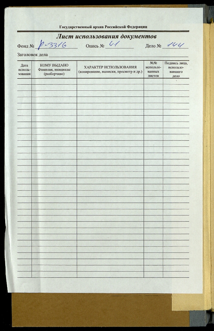 | Шифр хранения | ГА РФ. 3316 / 41 / 144 |