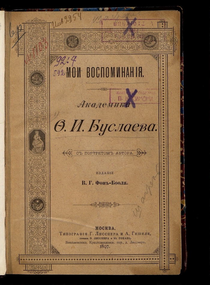 Мои воспоминания : с портретом автора / [сочинение] академика Ф. И. Буслаева. - Москва : издание В. Г. Фон-Бооля, 1897. -VIII, 387 с., [1] л. портр.. - Библиография в подстрочных примечаниях. - Экземпляр Самарской ОУНБ с рукописными пометами.