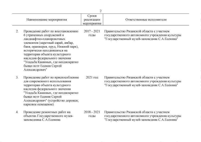 [Об утверждении плана развития объекта культурного наследия федерального значения "Есенинская Русь – место, связанное с жизнью и творчеством поэта С. А. Есенина"] : Распоряжение Правительства Российской Федерации от 9 ноября 2017 г. № 2477-р. - Москва, 2017. -1, 7 листов. - В конце текста подпись: Председатель Правительства Российской Федерации Д. Медведев. Место подписания: Москва. Электронная версия правового акта (8 файлов, JPEG : 4,1 МБ). Содержит: план основных мероприятий по развитию объекта культурного наследия федерального значения "Есенинская Русь – место, связанное с жизнью и творчеством поэта С. А. Есенина" на 2017-2021 годы : утвержден распоряжением Правительства Российской Федерации от 9 ноября 2017 г. № 2477-р. - Опубликовано в изданиях: Собрание законодательства Российской Федерации от 2017 г. , № 47 , ст. 7017 ; Официальный интернет-портал правовой информации (www.pravo.gov.ru) от 13.11.2017 г. (№ 0001201711130009).