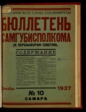 1927. № 10. Декабрь : (К перевыборам Советов). - Тип. № 1 им. т. Мяги "Самполиграфпрома", 1927. -68 с. : табл.. - На обл. загл.: Бюллетень Самгубисполкома. Содерж.: К перевыборам Советов / И. Нейбах. Подготовительная работа к перевыборам Советов / П. Кульманов. О работе с беднотой во время перевыборов Советов / Н. Тамбовцев. Перевыборы Советов и батрачество / И. Глушко. Работница и крестьянка в перевыборах Советов / Н. Тормасова, [и др.]. - Библиогр. в тексте. . -5000 экз.