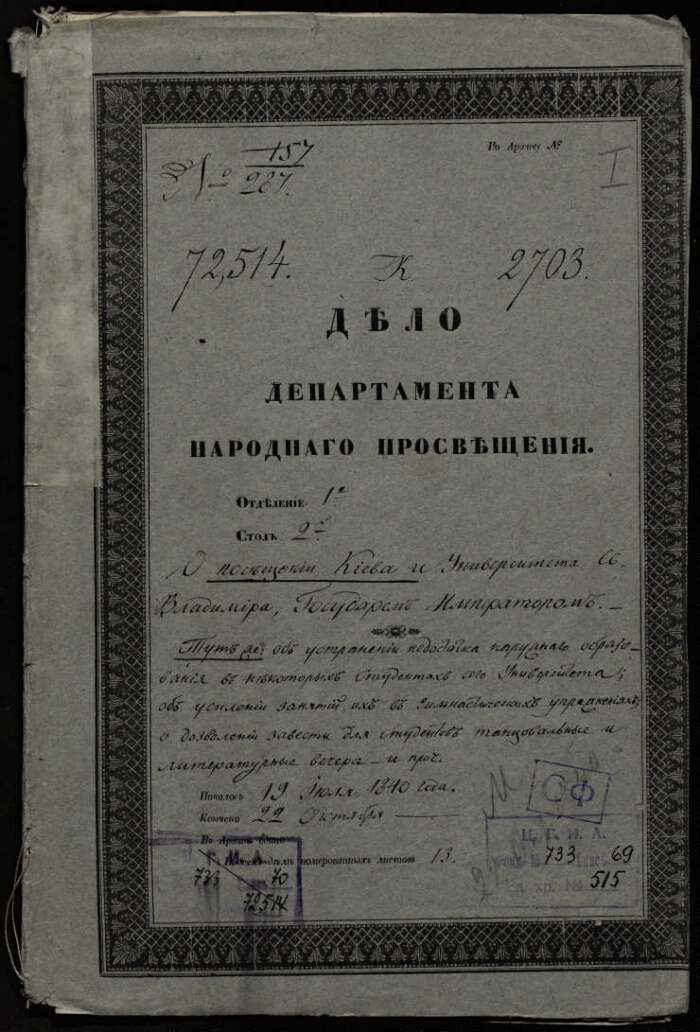 | Примечания | Рукописный текст. Чернила Оригинальный заголовок дела: Дело о посещении Киева и университета Святого Владимира Государем императором. Тут же об устранении недостатка наружного образования в некоторых студентах сего университета, об усилении занятий их в гимнастических упражнениях, о дозволении завести для студентов танцевальные и литературные вечера и прочее. 19 июля 1840 г. - 22 октября 1840 г. |