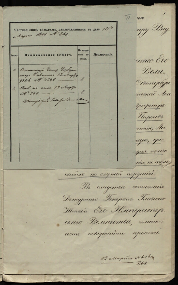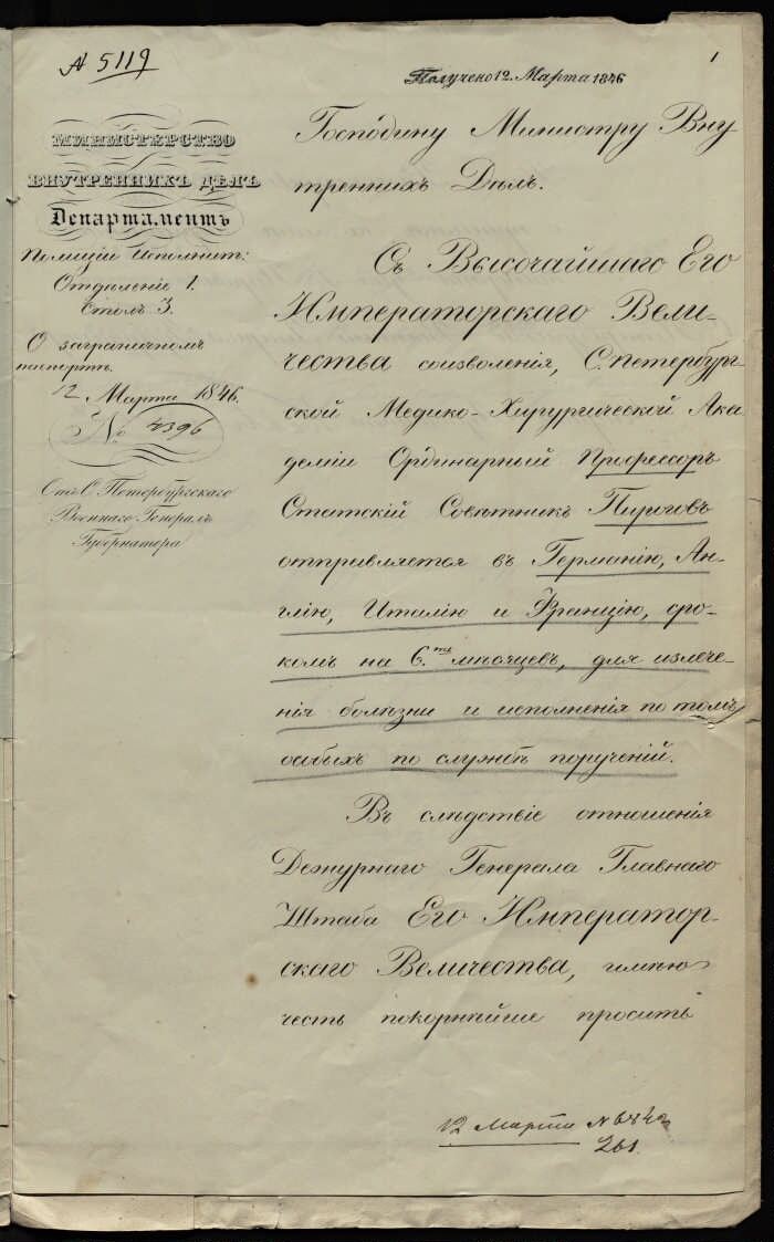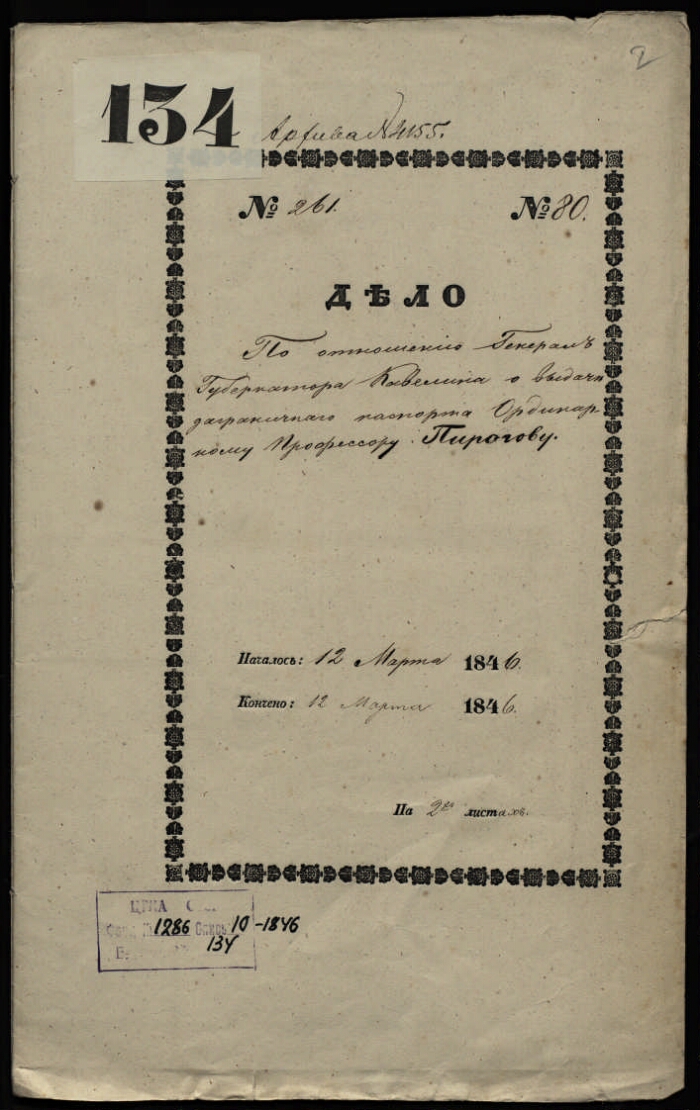 | Примечания | Рукописный текст. Чернила Оригинальный заголовок дела: По отношению генерал-губернатора Кавелина о выдаче заграничного паспорта ординарному профессору Пирогову : 12 марта 1846 года |