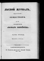 Лесной журнал, издаваемый Обществом для поощрения лесного хозяйства. - Санкт-Петербург, 1833-1851. - Загл.: 1833-1844 Лесной журнал, издаваемый Обществом для поощрения лесного хозяйства; 1845-1851 Лесной журнал, издаваемый Императорским Вольным экономическим обществом. В 1851 г. журн. выходил ежемесячно. Все номера объединены в два тома. Тит. листы номеров отсутствуют, имеется только тит. л. № 1/2 (янв./февр.), который приплетен к Т. 1. Вереха, П.Н. Систематический указатель лесоводственных статей: Лесного журнала (1833-1851 гг.)... Спб., 1899 - В изд.: "Известия С.-Петерб. лесного ин-та", 1899, Вып. 3. - Общее оглавление Лесного журнала за первое десятилетие 1833-1842. [Спб., 1842] 88 с. (В отд. переплете). - Оглавление Лесного журнала за 5 лет [1833-1837] (1837. - ч. 4 № 12. - с. 1-47 2-й паг.).