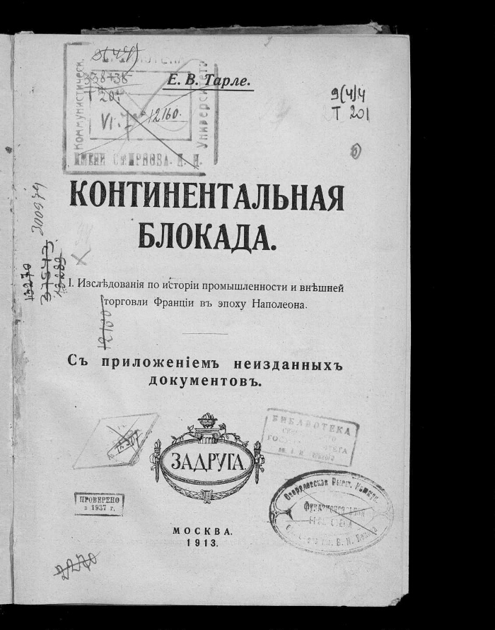 Континентальная блокада : с приложением неизданных документов / Е. В. Тарле. - Москва : Задруга, 1913-1916. - 25 см. -
