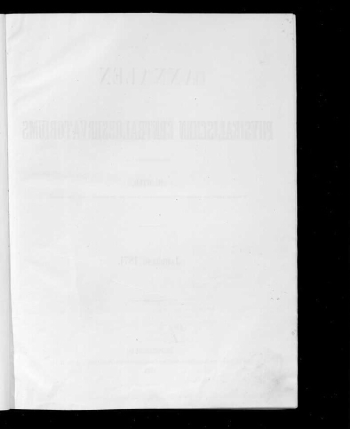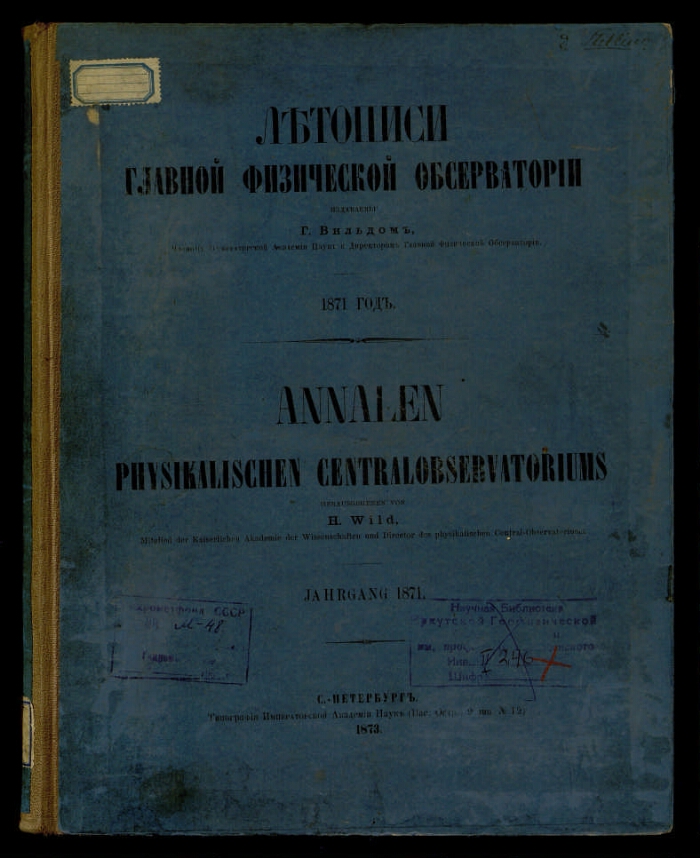 1871 год / Изд. Г. Вильдом, чл. Имп. Акад. наук и дир. Гл. физ. обсерватории. - Санкт-Петербург : Тип. Имп. Акад. наук, 1873. -[3], XXV, [1], 666, [1], 85 с. : табл.. - Часть текста на нем. яз. Парал. тит. л. на нем. яз. Обл. парал. на нем. яз. Библиогр. в подстроч. примеч.. - Экз.: с рукоп. помет., деф.: с. 25-28 ошибочно пронумерованы как с. 65-68, с. 462 ошибочно пронумерована как с. 642.