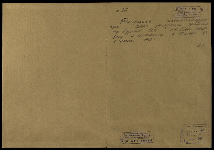 | Примечания | Заголовок дела на папке: Телеграмма Главнокомандующего Северо-западным фронтом генерала Рузского Н. В. В. Д. Бонч-Бруевичу о положении в Пскове от 5 марта 1917 г. |