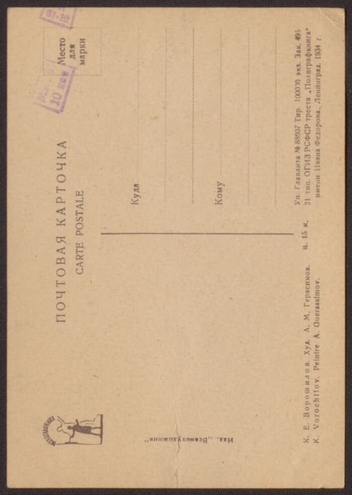 К. Е. Ворошилов. Худ. А. М. Герасимов = K. Vorochilov. Pientre A. Guerassimov : почтовая карточка. - (Санкт-Петербург: Президентская библиотека , 2014). -2 файла (2,7 МБ, JPEG) : цв.. - Режим доступа: интернет-портал Президентской библиотеки. Заглавие с экрана. Заглавие на русском и английском языках. Электронная репродукция почтовой карточки: К. Е. Ворошилов. Худ. А. М. Герасимов = K. Vorochilov. Pientre A. Guerassimov. Ленинград : Всекохудожник, 1934. 1 лист : цветной офсет. № 88607. 15 коп. Тираж 100000 экз. Местонахождение: Детский музей открытки, Санкт-Петербург. Копирование пользователями не разрешается.