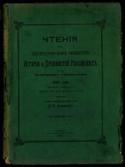 Чтения в Императорском обществе истории и древностей российских при Московском университете. - [Г. 1] 1846, № 1 - Г. 3 1847/1848, № 9 ; 1848, кн. 1 ; 1858, кн. 1 - 1918, кн. 1 (264). -Москва, 1846-1848, 1858-1918. - Издание выходило под заведованием секретарей Общества: с 1877, кн. 3 А. Н. Попова ; с 1881, кн. 3 Е. В. Барсова ; 1888, кн. 1 (144) А. Н. Попова ; с 1888, кн. 2 (145) Е. В. Барсова ; 1889, кн. 3 (150) И. Е. Забелина ; с 1889, кн. 4 (151) Е. В. Барсова ; с 1899, кн. 1 (188) И. Е. Забелина ; с 1899, кн. 4 (191) Е. В. Барсова ; с 1907, кн. 4 (223) М. К. Любавского ; с 1916, кн. 4 (259) С. А. Белокурова. В 1849-1857 гг. выходило под заглавием: Временник Императорского Московского общества истории и древностей российских. - Содержание "Чтений в Императорском обществе истории и древностей российских при Московском университете" первого, второго, третьего года (1846-1848) // Чтения в Императорском обществе истории и древностей российских при Московском университете. 1848, кн. 1. С. 1-16 (послед. паг.). - Гриневич А. И. Алфавитный указатель к периодическим изданиям Императорского общества истории и древностей российских при Московском университете, 1815-1862. Москва, 1862. 75 с. Прил. к: Чтения в Императорском обществе истории и древностей российских при Московском университете. 1862, кн. 2, ч. 1. - Бартенев П. И. (сост.). Указатель к повременным изданиям Императорского общества истории и древностей российских при Московском университете за пятьдесят лет, 1815-1865. Москва, 1866. XII, 134 стб. Прил. к: Русский архив. 1866, вып. 12. - Белокуров С. А. Указатель ко всем периодическим изданиям Императорского общества истории и древностей российских при Московском университете за 68 лет, 1815-1883. Москва, 1883. 198, II с.. - Забелин И. Е. Список и указатель трудов, исследований и материалов, напечатанных в повременных изданиях Императорского общества истории и древностей российских при Московском университете за 1815-1888 годы : с присовокуплением исторического очерка деятельности Общества с 1804 по 1884 г. В 2 вып. Москва, 1884-1889. Прил. к: Чтения в Императорском обществе истории и древностей российских при Московском университете. 1884, 1888. - Белокуров С. А. Указатель к "Чтениям в Императорском обществе истории и древностей российских при Московском университете" за 1882-1887 гг. Москва, 1888. 50 с. Прил. к: Чтения в Императорском обществе истории и древностей российских при Московском университете. 1888, кн. 2 (145). - Белокуров С. А. Указатель к "Чтениям в Императорском обществе истории и древностей российских при Московском университете" за 1888-1894 гг. Москва, 1895. 32 с. Отт. из: Чтения в Императорском обществе истории и древностей российских при Московском университете. 1895, кн. 1 (172). - Белокуров С. А. Указатель к "Чтениям в Императорском обществе истории и древностей российских при Московском университете" за 1895-1901 гг. Москва, 1902. 32 с. Отт. из: Чтения в Императорском обществе истории и древностей россиийских при Московском университете. 1902, кн. 1 (200). - Белокуров С. А. Указатель ко всем периодическим изданиям Императорского общества истории и древностей российских при Московском университете по 1915 г. // Чтения в Императорском обществе истории и древностей российских при Московском университете. 1916, кн. 2 (257). С. I-IV, 1-288 (послед. паг.).