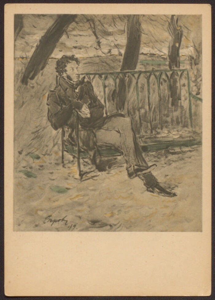 А. С. Пушкин. Рисунок карандашом, тушью и акварелью В. Серова, 1899 г. : [репродукция]. - (Санкт-Петербург: Президентская библиотека , 2015). -2 файла (3,2 Мб, JPEG) : цв.. - Режим доступа: интернет-портал Президентской библиотеки. Заглавие с экрана. Репродукция № 5 из издания: А. С. Пушкин и его литературное окружение : портреты и рисунки / редакция и вступительная статья И. С. Зильберштейна. Москва : издание Государственного литературного музея, 1938. 109, [3] с. ; 29 см + 25 л. ил. (Портреты, автографы, рисунки писателей и иллюстрации к литературным произведениям / Государственный литературный музей ; общая редакция директора музея Влад. Бонч-Бруевича ; вып. 2). Электронная версия репродукции: А. С. Пушкин. Рисунок карандашом, тушью и акварелью В. Серова, 1899 г. [Москва: издание Государственного литературного музея, 1938]. 1 лист : цветной офсет. Местонахождение: Детский музей открытки, Санкт-Петербург. Копирование пользователями не разрешается.