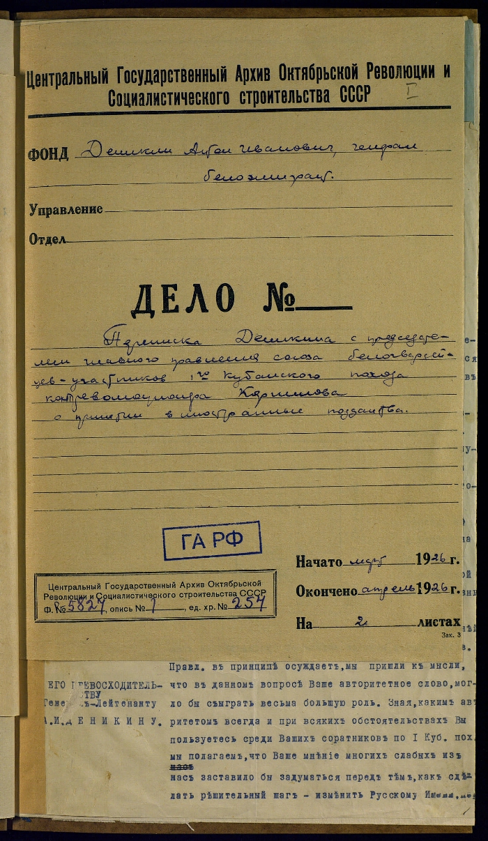 | Примечания | Заголовок дела на папке: Переписка А. И. Деникина с председателем Главного правления Союза белогвардейцев-участников 1 Кубанского похода контрреволюционера Корнилова о принятии в иностранное подданство Часть документов машинописная, часть - рукописная |