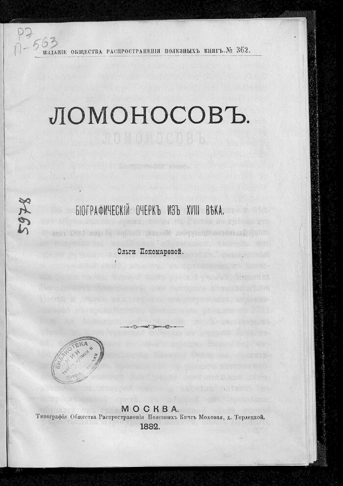 Ломоносов : биографический очерк из XVIII века / [сочинение] Ольги Пономаревой. - Москва : издание Общества распространения полезных книг, 1882. -21 с. ; 22 см. -