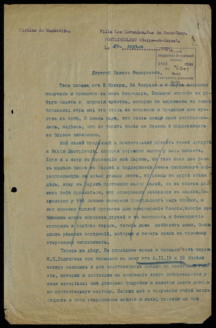 | Заголовок | Письма генерала Монкевица из Парижа с сообщением о контрреволюционной деятельности русских эмигрантов за границей |