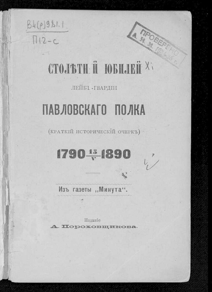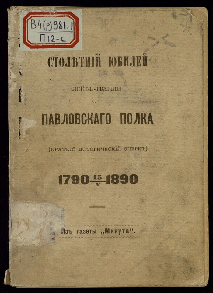Столетний юбилей лейб-гвардии Павловского полка : (краткий исторический очерк) : 1790 15/V 1890 / [Бывший гвардеец]. - Санкт-Петербург : издание А. Пороховщикова, 1890. -66 с. : ил. ; 17 см. -