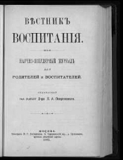 Вестник воспитания : Науч.-попул. журн. для родителей и воспитателей. - Москва, 1898. - Изд-во: Г. 1 1890 - Г. 6 1895 № 6 Ред.-изд. д-р Е.А. Покровский; Г. 6 1895 - Г. 9 1898 № 2 Изд. насл. Е.А. Покровского; Г. 9 1898 № 3 - Г. 28 1917 Ред.-изд. д-р Н.Ф. Михайлов. Подзаг.: Г. 1 1890 - Г. 11 1900 Науч.-попул. журн. для родителей и воспитателей; Г. 12 1901 - Г. 28 1917 Науч.-попул. журн.