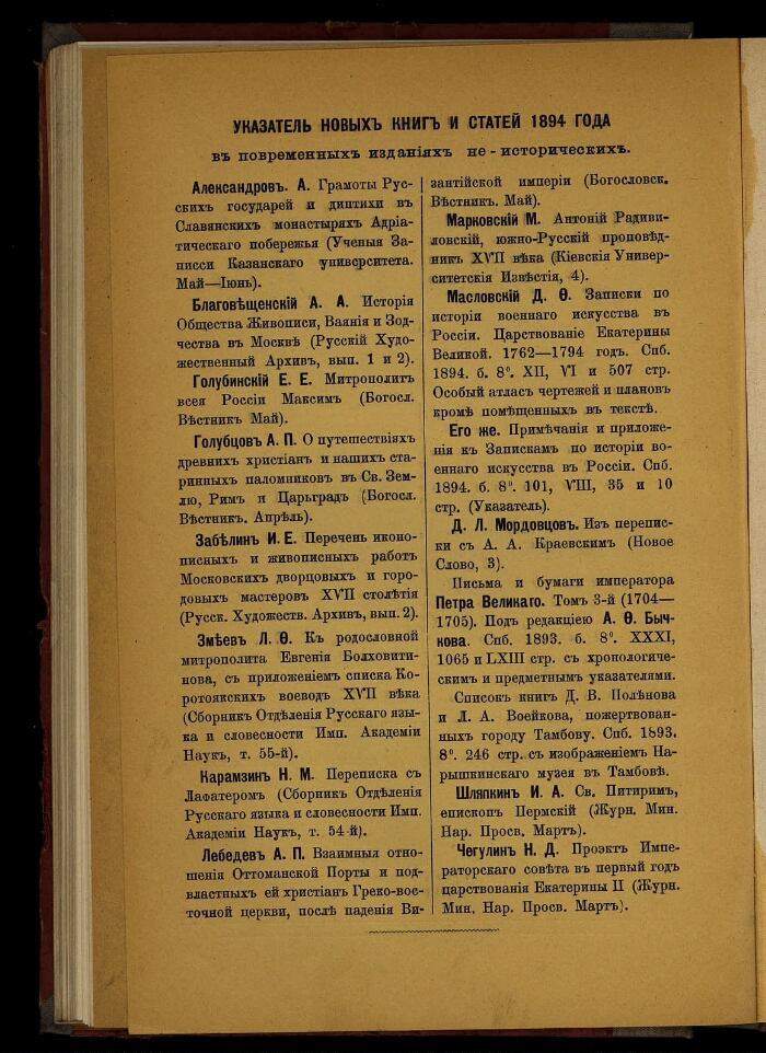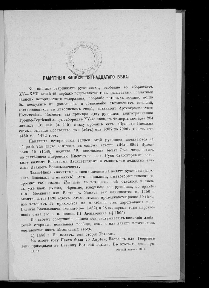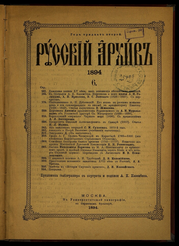 Г. 32 1894, [кн. 2], 6. - Университетская типография, 1894. -[150] с. : ил.. - Содержит: Памятные записи XV века как дополнения летописных сказаний. К биографии А. К. Казембека : переписка о нем князя А. Н. Голицына, А. П. Ермолова, В. С. Ланского (1823-1827) : с портретом. Подполковник А. П. Дубовицкий. Его жизнь по разным монастырям и его самооправдание в письме к архимандриту Платону. (1824-1842) : статья священника В. Жмакина. Переписка Антония, архиепископа Воронежского с А. Н. Муравьевым об Уткинской гравюре Св. Митрофания (1838-1839). Воронцовский "перипл" Черного моря (1836) / с предисловием А. Л. Зиссермана. Заметка к "Истории Смутного времени" / [соч.] Д. И. Иловайского (С. 302–303 (сканы 146–147)), [и другие материалы]. - Библиография в подстрочных примечаниях и в тексте.