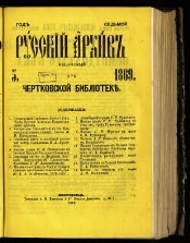 Русский архив : Ист.-лит. сб. : Изд. при Чертков. б-ке. - Москва, 1863-1917, 1990-. - Прекр. на 1917 № 2/3. Возобновл. с 1990. Изд-во: 1864 П. Бартенев и Н. Киселев; 1865-1897, 1900-1912 П. Бартенев; 1898-1899 П. и Ю. Бартеневы; 1913-1917 П. Бартенев (мл.); Вып. 1 (1990) Столица; Вып. 2 (603) (1992) МГП "Рус. архив". Подзаг.: 1863 Ист.-лит. сб. Изд. при Чертков. б-ке; 1864 Ист.-лит. сб., посвящ. преимущественно изуч. России в XVIII-XIX столетиях. Изд. при Чертков. б-ке; 1865-1866 Ист.-лит. сб., изд. ежемес. вып. при Чертков. б-ке и посвящ. преимущественно изуч. России в XVII и XIX столетиях; 1867-1872 Изд. при Чертков. б-ке; 1990 Рус. ист. журн.