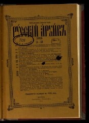 Русский архив : Ист.-лит. сб. : Изд. при Чертков. б-ке. - Москва, 1863-1917, 1990-. - Прекр. на 1917 № 2/3. Возобновл. с 1990. Изд-во: 1864 П. Бартенев и Н. Киселев; 1865-1897, 1900-1912 П. Бартенев; 1898-1899 П. и Ю. Бартеневы; 1913-1917 П. Бартенев (мл.); Вып. 1 (1990) Столица; Вып. 2 (603) (1992) МГП "Рус. архив". Подзаг.: 1863 Ист.-лит. сб. Изд. при Чертков. б-ке; 1864 Ист.-лит. сб., посвящ. преимущественно изуч. России в XVIII-XIX столетиях. Изд. при Чертков. б-ке; 1865-1866 Ист.-лит. сб., изд. ежемес. вып. при Чертков. б-ке и посвящ. преимущественно изуч. России в XVII и XIX столетиях; 1867-1872 Изд. при Чертков. б-ке; 1990 Рус. ист. журн.