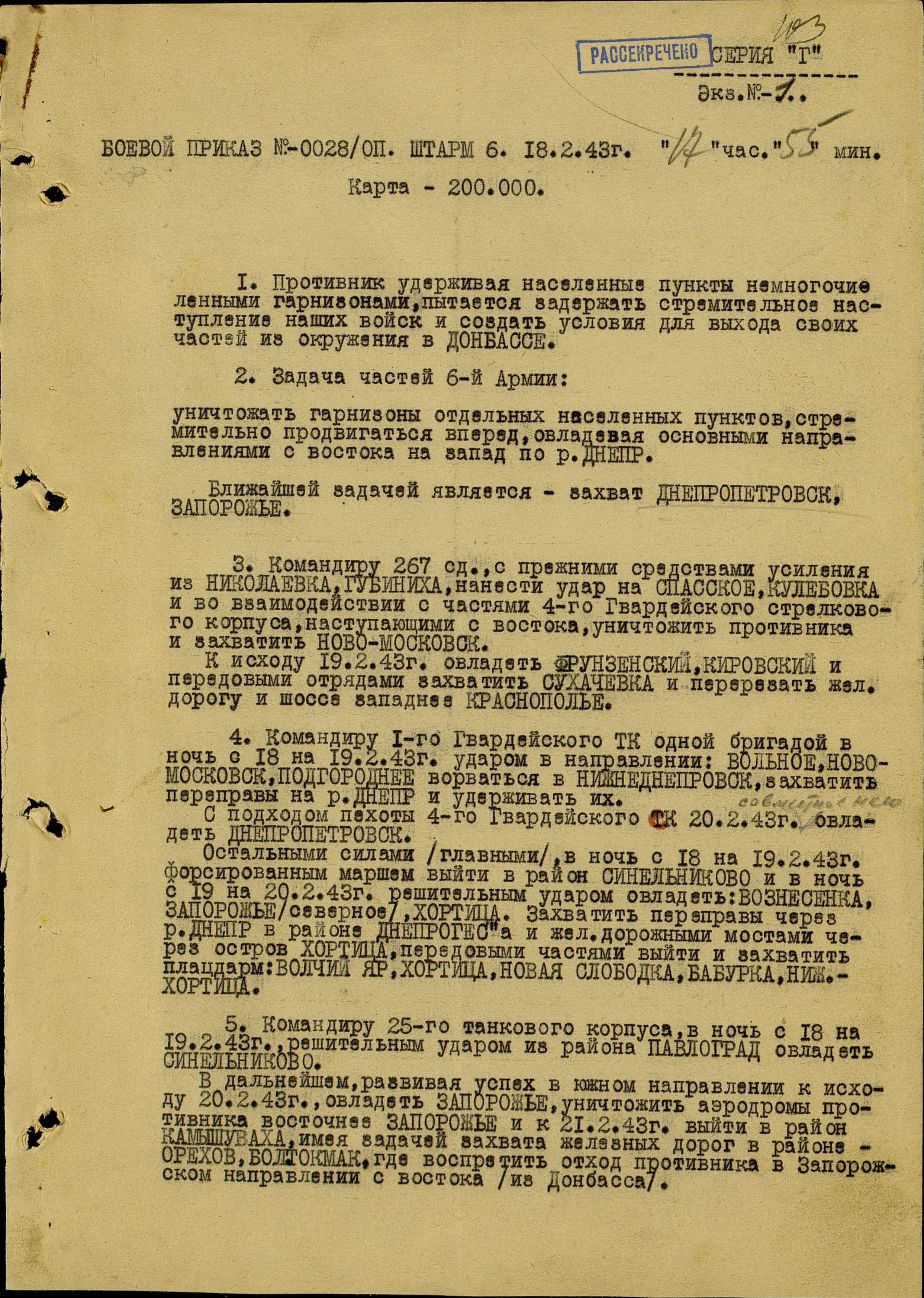 В Комплексе размещены также документы о наступательной операции войск Юго-Западного и Южного фронтов в Донбассе (29 января – 18 февраля 1943 года): директивы Ставки Верховного Главнокомандования, приказы, боевые донесения, оперативные сводки, отчеты, выдержки из журналов боевых действий. Среди важнейших документов – боевые донесения штаба Юго-Западного фронта в Ставку Верховного Главнокомандования о переходе войск фронта в общее наступление 29 января 1943 года, об освобождении Ворошиловграда (ныне – Луганск) и Краснодона 14 февраля 1943 года.