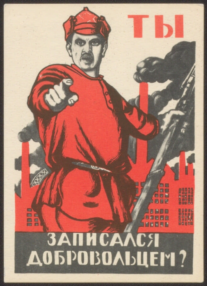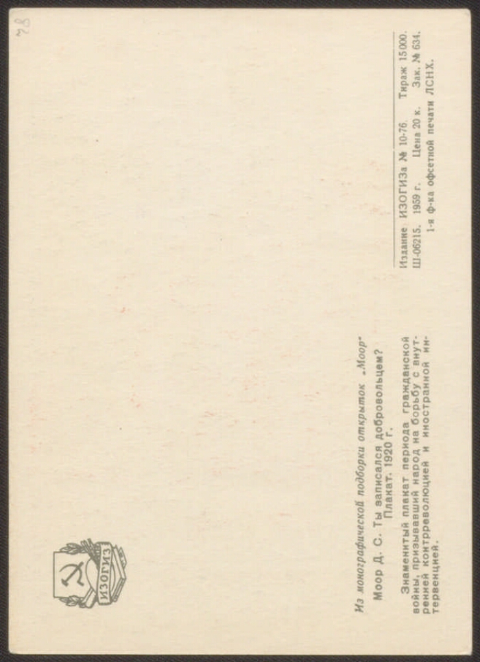 Моор Д. С. Ты записался добровольцем? Плакат. 1920 г. : [открытка]. - Электрон. дан. -(Санкт-Петербург: Президентская библиотека , 2017). -2 файла (1,5 МБ, JPEG). - Режим доступа: интернет-портал Президентской библиотеки. Заглавие с экрана. На оборотной стороне - пояснительный текст к изображению. Открытка является частью комплекта: Моор. Плакаты, карикатуры / редактор Г. Малентович ; автор текста М. Савелов. Ленинград : Изогиз, 1959. 12 открыток в обложке + Вкладыш с текстом. 1 р. 80 коп. Электронная репродукция открытки: Моор Д. С. Ты записался добровольцем? Плакат. 1920 г. Ленинград : Изогиз, 1959. 1 лист : цветной офсет. Ш-06215. 20 коп. Тираж 15000 экз. Местонахождение: Балаченкова, Н. В., частное собрание. Копирование пользователями не разрешается. Репродукция агитационного плаката "Ты записался добровольцем?" художника-графика Д. С. Моора, призывающего добровольно вступать в ряды Красной Армии. - Из коллекции известного петербургского коллекционера Натальи Владимировны Балаченковой, заведующей библиотекой школы № 331 в Санкт-Петербурге, руководителя школьного музея открытки. Коллекция Н. В. Балаченковой содержит более 10 тысяч открыток, среди которых - открытки с фотографиями актрис и актеров советского кино, открытки с видами Санкт-Петербурга, поздравительные открытки 1950-1980-х гг. и другие
