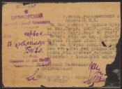 Ответ на запрос Липковой М. М. о судьбе мужа Липкова Михаила Георгиевича / Приморский районный военный комиссариат города Ленинграда. - Ленинград, [1945-1946]. -1 лист, бумага. - Режим доступа: интернет-портал Президентской библиотеки. Справка представлена на листе бумаги, машинописный текст. На бланке штамп фиолетовыми чернилами: НКО СССР, Приморский районный военный комиссариат города Ленинграда. В электронном фонде Президентской библиотеки представлены материалы брата Липкова М. Г. Липкова Дмитрия Георгиевича. Электронная версия (2 файла, JPEG : 1,1 МБ). Копирование пользователями не разрешается. Ответ Приморского районного военного комиссариата города Санкт-Петербурга № 13п/2л на запрос Липковой Марии Михайловны о судьбе мужа Липкова Михаила Георгиевича. Ответ составлен 17 февраля [1945 или 1946 г.]. Из текста: "... На Ваш запрос о судьбе в/мужа Липкова Мих. Георг. 1902 г. рожд., пр[едлагаем?] просить Центр. Бюро по учёту потерь РККА ..." В конце текста собственноручные подписи: Приморский райвоенком, подполковник (неразборчиво) и начальник бюро писем, политрук (неразборчиво). - Липков Михаил Георгиевич (1902-1941) - уроженец г. Выкса Горьковской области. Военный инженер 3-го ранга. Призван на фронт Великой Отечественной войны 31 августа 1941 г. и 2 сентября направлен в 5-й инженерный полк. Пропал без вести в ноябре 1941 г.