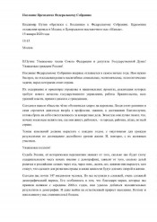 Послание Президента Федеральному Собранию, 15 января 2020 года, 13:15 / Президент России, официальный сайт. - Москва, 2020. -21 лист + видеозапись (72 мин 50 с) : Ежегодное послание Президента Российской Федерации Владимира Путина Федеральному Собранию, 15 января 2020 года. - Владимир Путин обратился с Посланием к Федеральному Собранию. Церемония оглашения прошла в Москве, в Центральном выставочном зале "Манеж". На церемонии присутствовали около 1300 человек: члены Совета Федерации, депутаты Государственной Думы, члены Правительства, руководители Конституционного и Верховного судов, губернаторский корпус, председатели законодательных собраний субъектов Федерации, главы традиционных конфессий, общественные деятели, в том числе главы общественных палат регионов, руководители крупнейших средств массовой информации