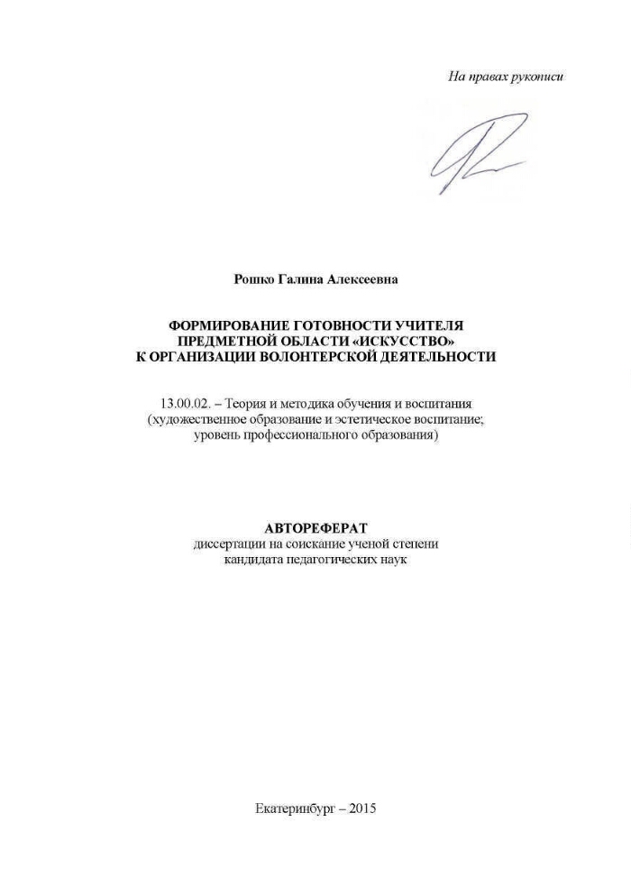 Формирование готовности учителя предметной области "Искусство" к организации волонтерской деятельности : автореферат диссертации на соискание ученой степени кандидата педагогических наук : специальность 13.00.02 / Рошко Галина Алексеевна ; [Уральский государственный педагогический университет]. - Екатеринбург, 2015. -23 с. : ил. ; 21 см. - Библиография: с. 22-23 (17 названий). . -100 экз. экз.