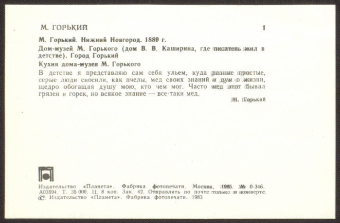 М. Горький [Изоматериал : электронный ресурс] : [комплект открыток]. - Электронные данные (26 файла, JPEG : 16,2 МБ). -(Санкт-Петербург: Президентская библиотека , 2023). - Режим доступа: интернет-портал Президентской библиотеки. Заглавие с экрана. На обороте каждой открытки текст. Электронная репродукция комплекта открыток: М. Горький [Комплект открыток]. Москва : Планета, 1985. 12 листов в обложке : ч.-б. офсет. № 0-346. А 03594. Цена каждой открытки 8 коп. Тираж 35000. Местонахождение: Детский музей открытки, Санкт-Петербург. Экземпляр дефектный: утрата части обложки. Копирование пользователями не разрешается.