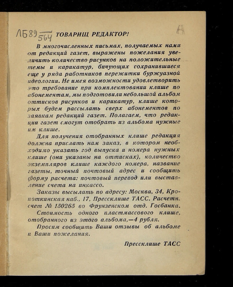 Описание Альбом рисунков и карикатур. - Москва : Тип. ТАСС, 1953. -63 с. : ил. ; 17,2 х 13,3 см. - (Прессклише ТАСС). -Экз.: без тит. л. . 1. Государственная власть (коллекция). Источник электронной копии: ПБМесто хранения оригинала: ГПИБ Издательство Тип. ТАСС