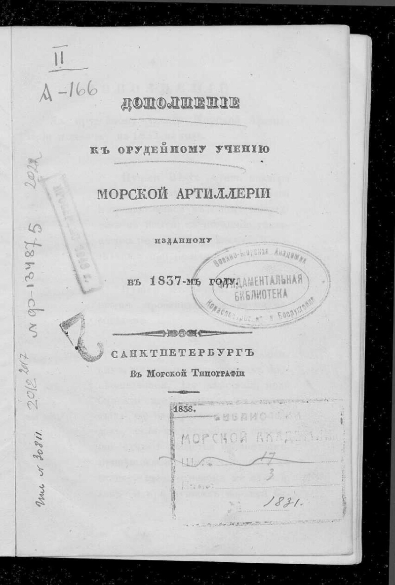 Дополнение к Орудейному учению морской артиллерии, изданному в 1837 году. - Санкт-Петербург : Морская тип., 1838. -27, [1] с. : табл. ; 19,8 х 12,8 см. - .