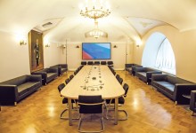 Зал круглого стола предназначен для проведения совещаний, мастер-классов, секций в рамках конференций, презентаций и различных мероприятий в формате круглого стола. Предельная вместимость зала – 40 человек, за столом может быть организовано до 20 рабочих мест, оснащённых конференц-системой. Предусмотрена возможность аудиовидеопротоколирования, установки плазменной панели и дополнительных стульев.