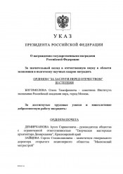 О награждении государственными наградами Российской Федерации : Указ Президента Российской Федерации от 26 апреля 2007 года № 545. - Москва, 2007. - 8 л. - Электронная копия. За значительный вклад в отечественную науку в области экономики и подготовку научных кадров наградить ... ; За досигнутые трудовые успехи и многолетнюю добросовестную работу наградить ... ; За заслуги в научной деятельности и подготовке высококвалифицированных кадров присвоить почетное звание ... ; За заслуги в области архитектуры и многолетнюю плодотворную работу присвоить почетное звание ... ; За многолетнюю плодотворную изобретательскую деятельность присвоить почетное звание ... ; За заслуги в области жилищно-коммунального хозяйства и многолетний добросовестный труд присвоить почетное звание ... ; За заслуги в области строительства и многолетний добросовестный труд присвоить почетное звание ... ; За заслуги в развитии физической культуры и спорта присвоить почетное звание ... ; За заслуги в области энергетики и многолетний добросовестный труд присвоить почетное звание ...