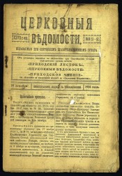 Церковные ведомости, издаваемые при Святейшем правительствующем Синоде : еженедельное издание с прибавлениями. - Санкт-Петербург, 1888-1918. - Выходит в 2-х частях: официальная и неофициальная. Неофициальная часть выходит под заглавием: Прибавления к Церковным ведомостям. За 1915-1916 гг. приложение к газете: Приходский листок. Заглавие: 1888-1917 № 8, 1918 № 1-3/4 Издаваемые при Святейшем правительствующем Синоде. Еженедельное издание с прибавлениями ; 1917 № 9/15-48/49 ... Еженедельное издание ; 1918 № 5-19/20 Издание православной русской церкви. Еженедельное издание с прибавлениями ; 1918 № 21/22 Издание православной русской церкви. Издание с прибавлениями ; 1918 № 23/24 Издание православной русской церкви. Издательство: 1918 № 1-3/4 Издательский совет при Святейшем Синоде ; 1918 № 5-23/24 Издательский совет при Священном Синоде. Приложения: Приходское чтение ; Определения Синода, молитвы, листовки, воззвания и т.п. : 101 брошюра. Алфавитно-предметный указатель к официальной части "Церковных ведомостей" за 1888-1897 годы : приложение к журналу. Санкт-Петербург, 1899. - Алфавитно-предметный указатель к официальной части "Церковных ведомостей" за 1898-1910 годы : приложение к журналу ... 1911, № 1-46. Санкт-Петербург, 1911.