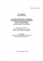 Российское военно-уголовное законодательство и его эволюция в период абсолютизма : (XVIII - начало XX вв.) : (историко-правовое исследование) : автореферат диссертации на соискание ученой степени кандидата юридических наук : специальность 12.00.01 / Сухондяева Татьяна Юрьевна ; [С.-Петерб. гуманитар. ун-т профсоюзов]. - Санкт-Петербург, 2006. - 23 с. ; 21. - Место защиты: С.-Петерб. гуманитар. ун-т профсоюзов. - Список работ авт.: с. 22-23 (6 назв.). - Библиогр. в подстроч. примеч. . - 100 экз.