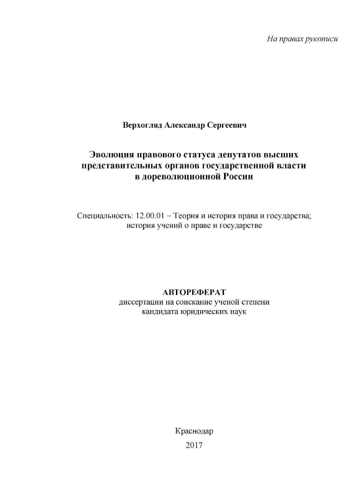 Эволюция правового статуса депутатов высших представительных органов государственной власти в дореволюционной России : автореферат диссертации на соискание ученой степени кандидата юридических наук : специальность 12.00.01 / Верхогляд Александр Сергеевич ; [Место защиты: Кубан. гос. ун-т]. - Краснодар, 2017. -27 с.. - Библиогр.: с. 25-27 (17 назв.).