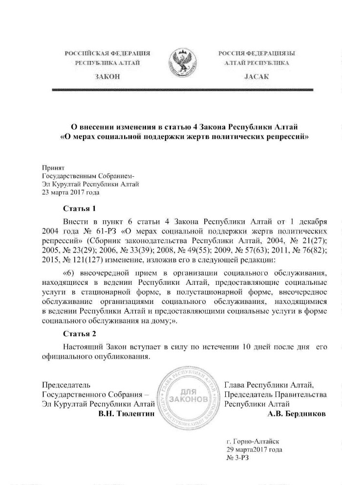 О внесении изменения в статью 4 Закона Республики Алтай "О мерах социальной поддержки жертв политических репрессий"