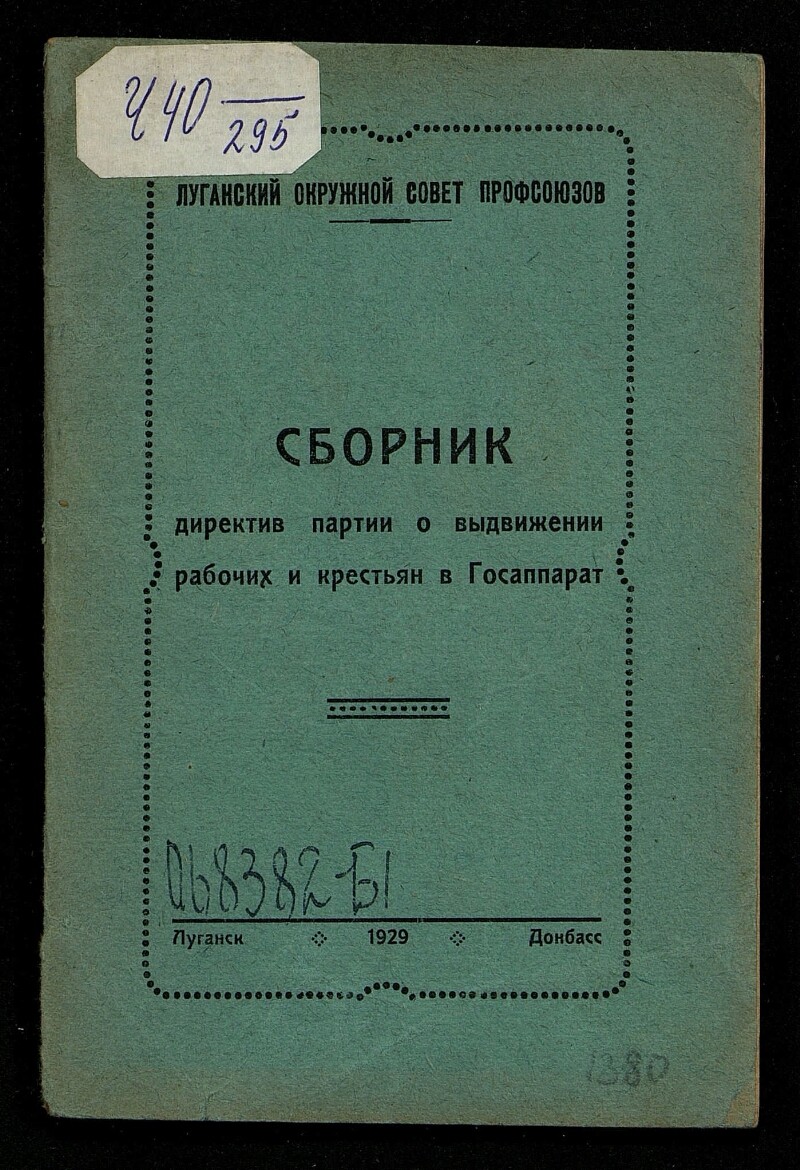 Сборник директив партии о выдвижении рабочих и крестьян в Госаппарат. Луганск : [Б. и.], 1929.