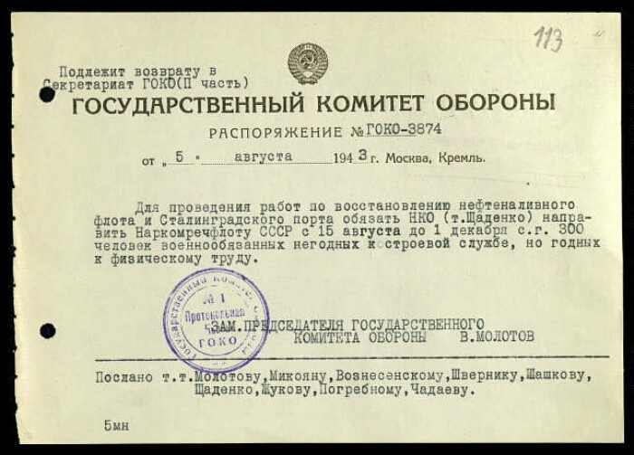 Распоряжение ГКО СССР № 3874 о направлении 300 военнообязанных, не годных к строевой службе, на восстановление нефтеналивного флота и Сталинградского порта