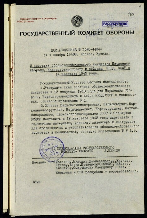 Постановление ГКО СССР № 4484 с о поставке обознохозяйственного имущества Наркомату обороны, Наркомату военно-морского флота и войскам Наркомата внутренних дел в 4 квартале 1943 г., с приложением плана поставки и ведомостей материалов.