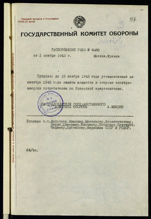 Распоряжение ГКО СССР № 4486 о продлении до 15 ноября 1943 г. лимита мощности и отпуска электроэнергии потребителям по Уральской энергосистеме, установленного на октябрь 1943 г.