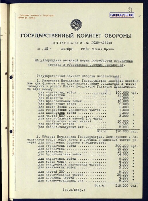 Постановление ГКО СССР № 4581 сс об утверждении месячной нормы потребности пополнения фронтам и образования резерва пополнения, с приложением докладной записки Смородинова И. В., Изотова Сталину И. В.