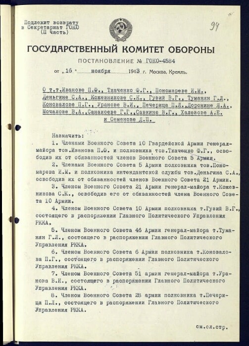 Постановление ГКО СССР № 4584 о назначении Иванова П. Ф. и Ткаченко Ф. Г. членами Военного совета 10-й гвардейской армии, Пономарева И. М. и Деньгина С. А. - членами Военного совета 5-й армии, Кожевникова С. К. - членом Военного совета 21-й армии, Гузия В. Г. - членом Военного совета 10-й армии, Туманяна Г. Л. - членом Военного совета 46-й армии, Коновалова П. Г. - членом Военного совета 6-й армии, Уранова В. И. - членом Военного совета 51-й армии, Печерицы П. Л. - членом Военного совета 28-й армии; об освобождении от обязанностей членов Военного совета 10-й гвардейской...
