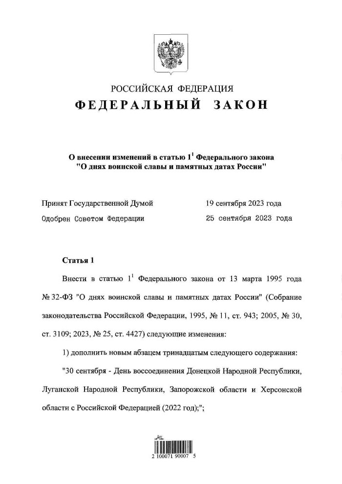 Российская Федерация. Законы. О внесении изменений в статью 1-1 Федерального закона "О днях воинской славы и памятных датах России". Москва, 2023.