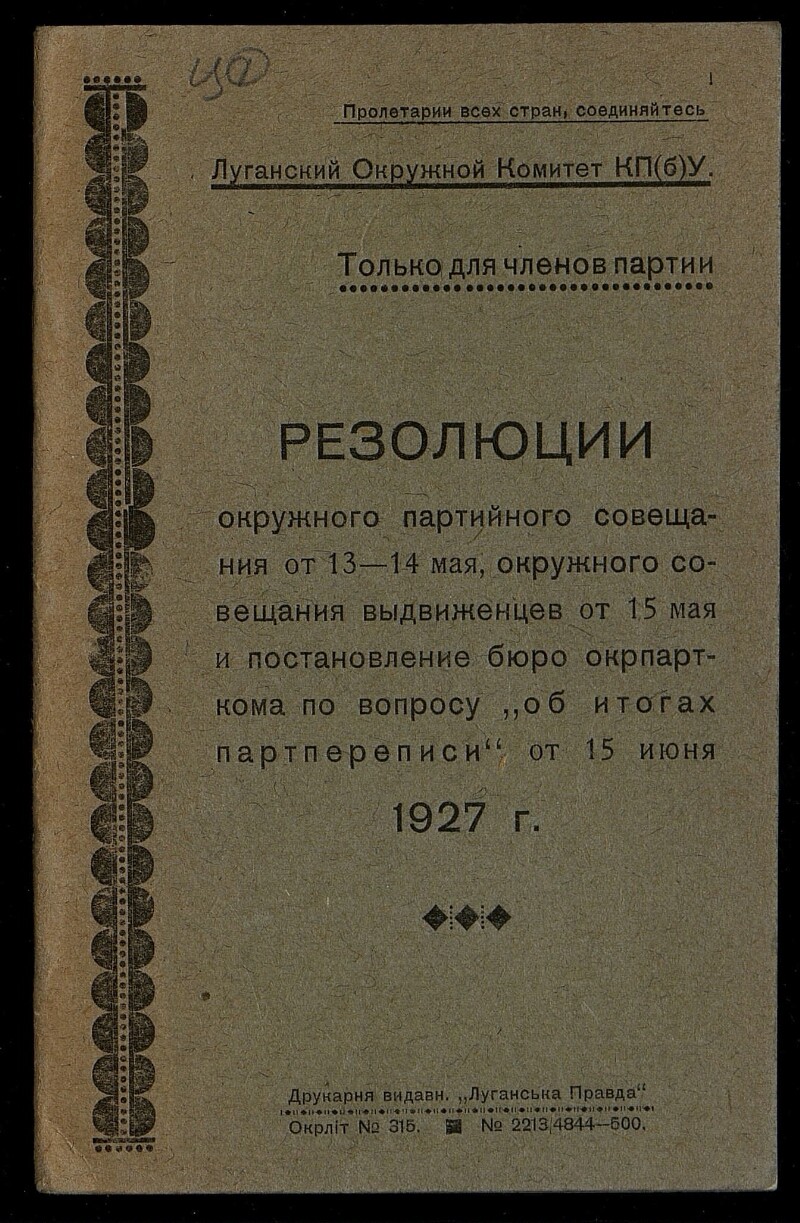 Резолюции окружного партийного совещания от 13-14-го мая, окружного совещания выдвиженцев от 15-го мая и постановление бюро окрпарткома по вопросу "об итогах партпереписи" от 15-го июня 1927 г.[Луганск] : Друкарня в-ва "Луганська Правда", [1927].