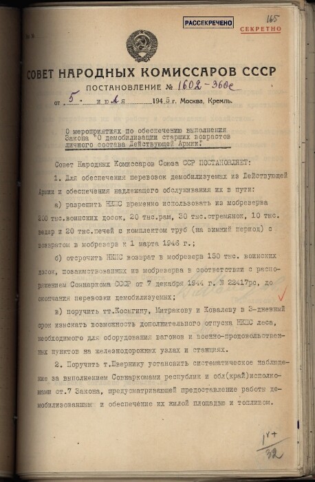 Постановление № 1602-360 с СНК СССР "О мероприятиях по обеспечению выполнения Закона ”О демобилизации старших возрастов личного состава Действующей Армии”"